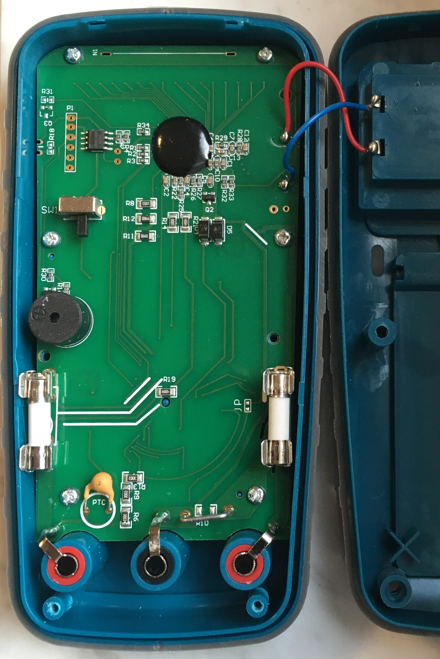 Das Gehäuse lässt sich per vier Schrauben einfach öffnen, z. B. wenn man bei Strommessungen einmal nicht aufgepasst hat und eine der Feinsicherungen durchgebrannt ist.