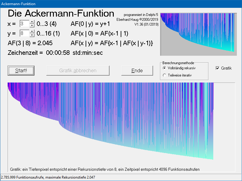 Und statt stolzen 58 sec Zeichenzeit wären es ohne Grafikausgabe bei AF(3, 8) nur noch 15 msec Rechenzeit (bei vollständig rekursiver Berechnung)!