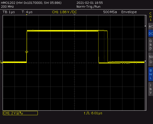Damit gibt es nur noch zwei unterschiedliche Messzeiten, nämlich 5,76 µsec (für mehr als 99% aller Zahlen) und ca. 6 µsec bei Überlauf während der Berechnung der Stelle DEZ0 (für nur 370 Zahlen ≥49.146).